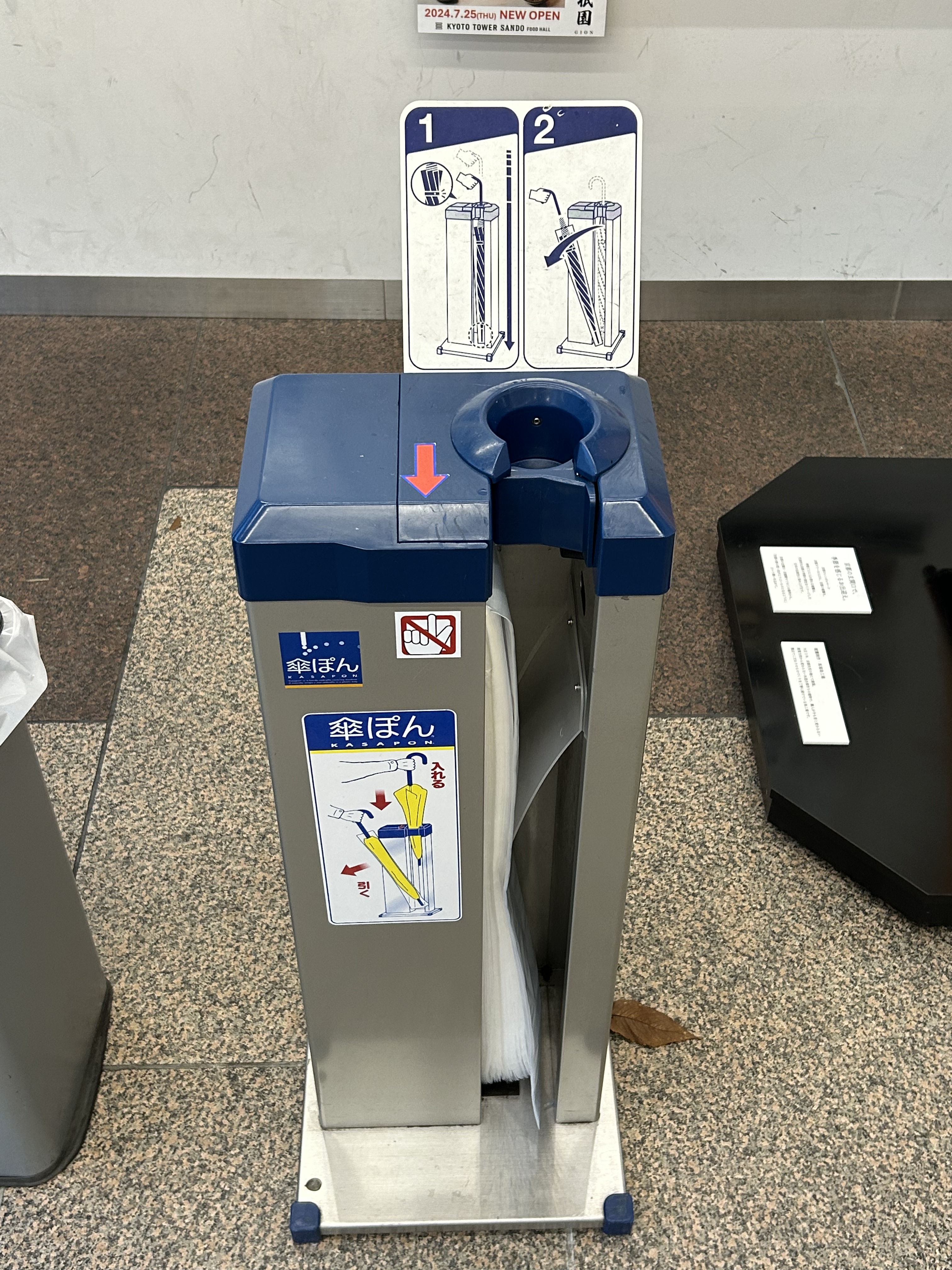 Når man kommer ude fra regnen med en paraply, er det vigtigt at den stilles udenfor. Ellers skal den tørres eller i en maskine som denne, hvor man kan få en plasticpose om.