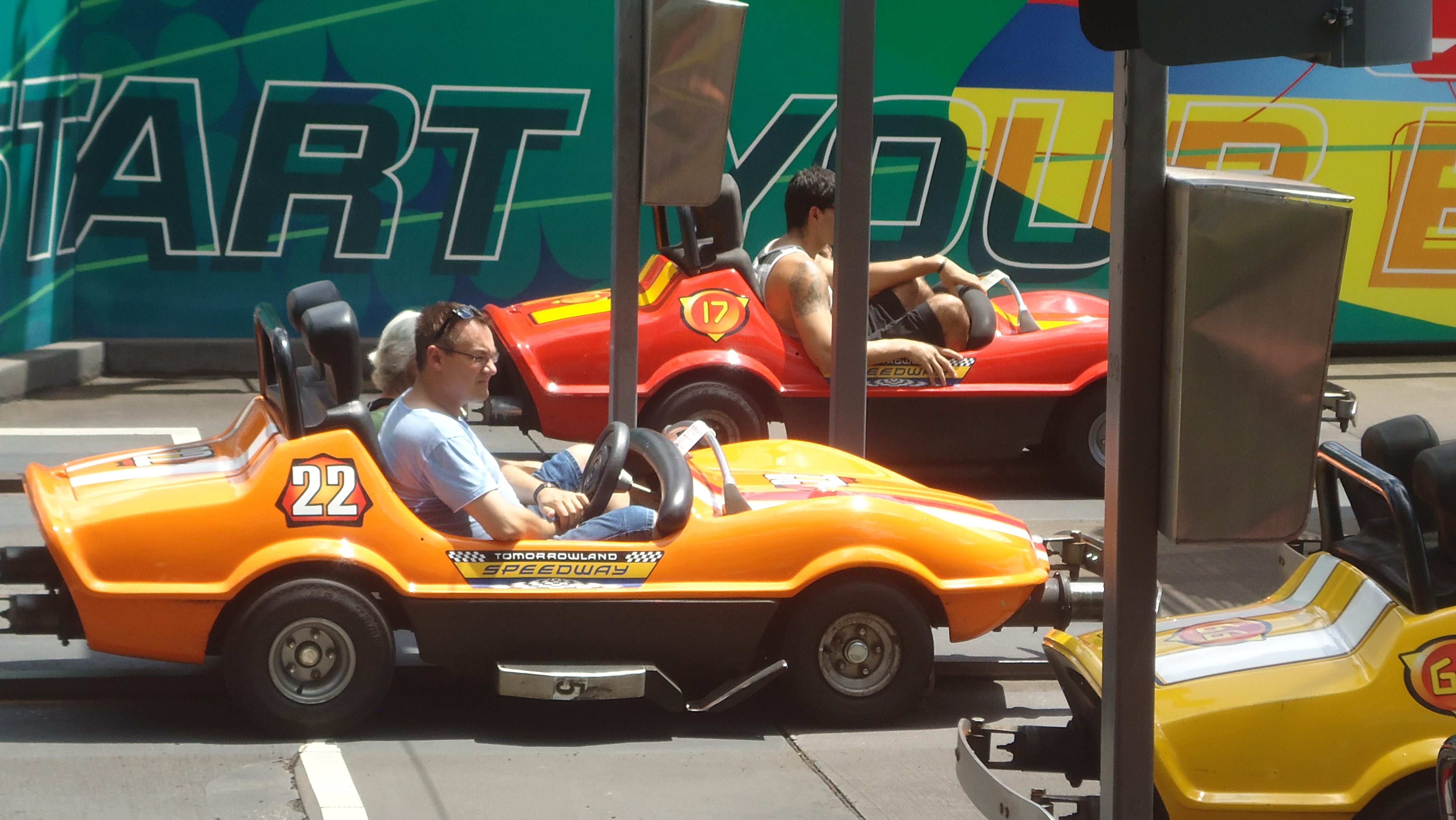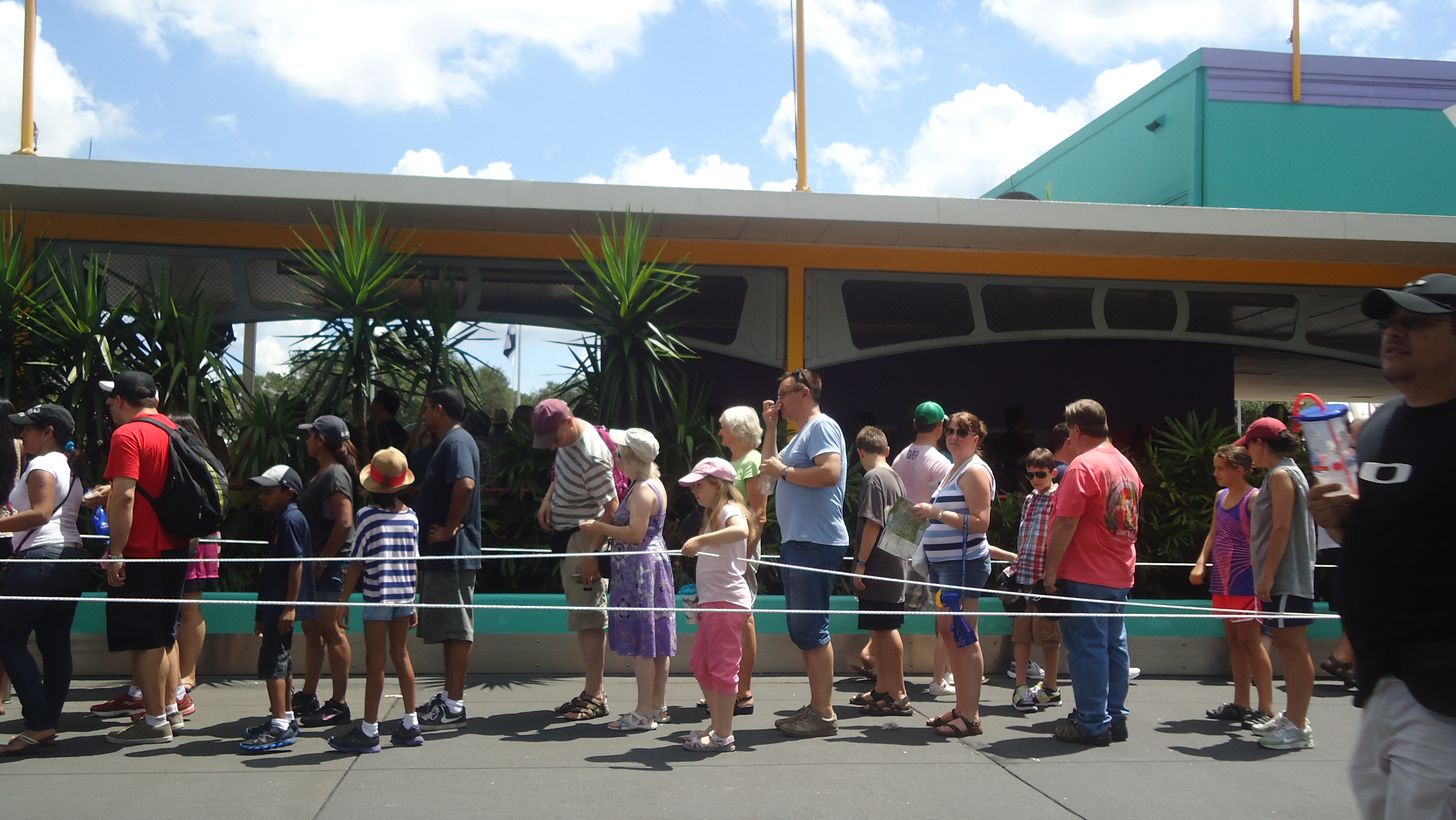 Vi moedte et bom-system, der minder om betalingsanlaegget ved Storebaeltsbroen – betalte 15$ for parkering og blev hurtigt ledt videre til parkeringsanlaegget, hvor omraaderne var opdelt med navne paa karaktererne fra Disneys eventyr. Saaledes kom vi til at holde i bane 18 i omraadet “Simba”, og derfra blev vi koert i tog ind mod hovedindgangen.